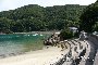 <小杭海水浴場 詳細> 柏方面から24号線沿いムロノキ鼻を回り込んだ付近を右に曲がります。道が狭いので注意が必要です。釣り客用に波止場付近に駐車スペースがあります。浜は真ん中に岩場を挟んで、左右に分かれています。手前の浜はサラサラの綺麗な砂です。こちらが一般用の海水浴場になっていると思われます。奥の方は堺市の施設「日高少年自然の家」となっています。